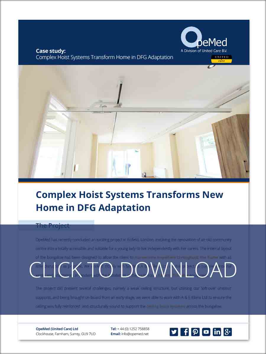 Accessible home project with complex hoist systems transforms new home in DFG adaptation. With our multi-room solutions, the goal of this project was to ensure independance and easy transfer throughout the property.
