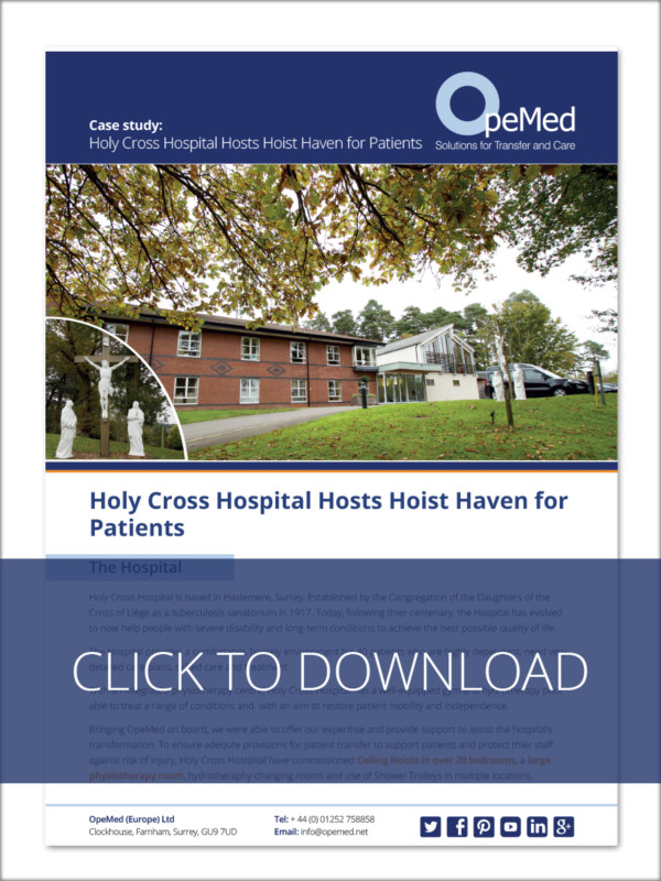 Holy Cross Hospital is a prestigious facility offering an outstanding level of care and recent winners of an Outstanding CQC rating. OpeMed has been working with Holy Cross Hospital to provide and support their high standard of care with a range of vital equipment. Installing a number of Ceiling Hoists, Shower Trollies in a number of rooms throughout the hospital. OpeMed equipment ensures risk of injury to staff are dramatically reduced and patients have an easier stay.