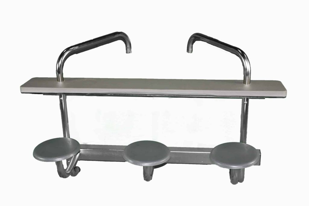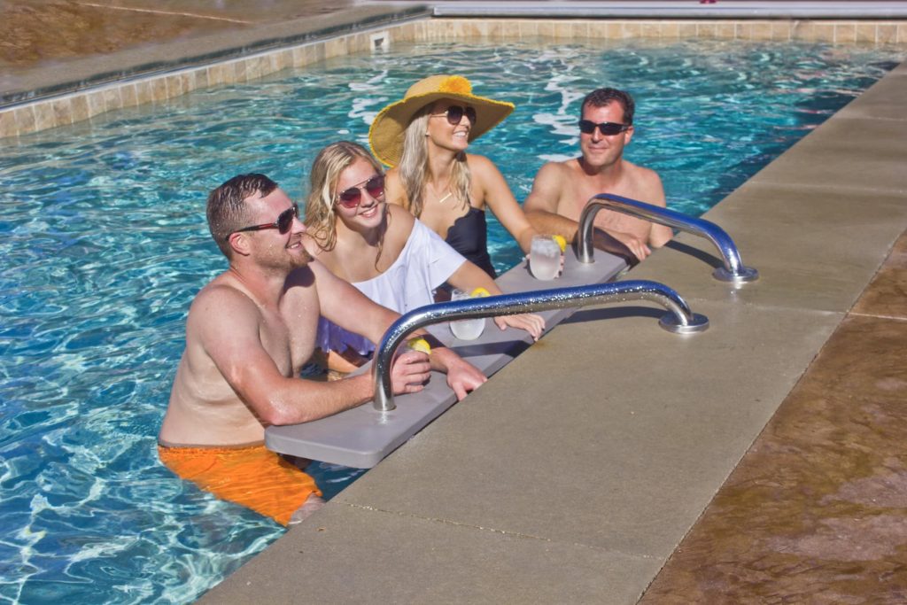 Upgrade your pool experience with the Over the Edge 3-Seat Bar Top Table. The table and bar stools have been designed for comfort, safety and the best in-water experience. The pool bar table hangs Over the Edge of the pool using standard ladder holes or new mounts can be added to any pool deck.