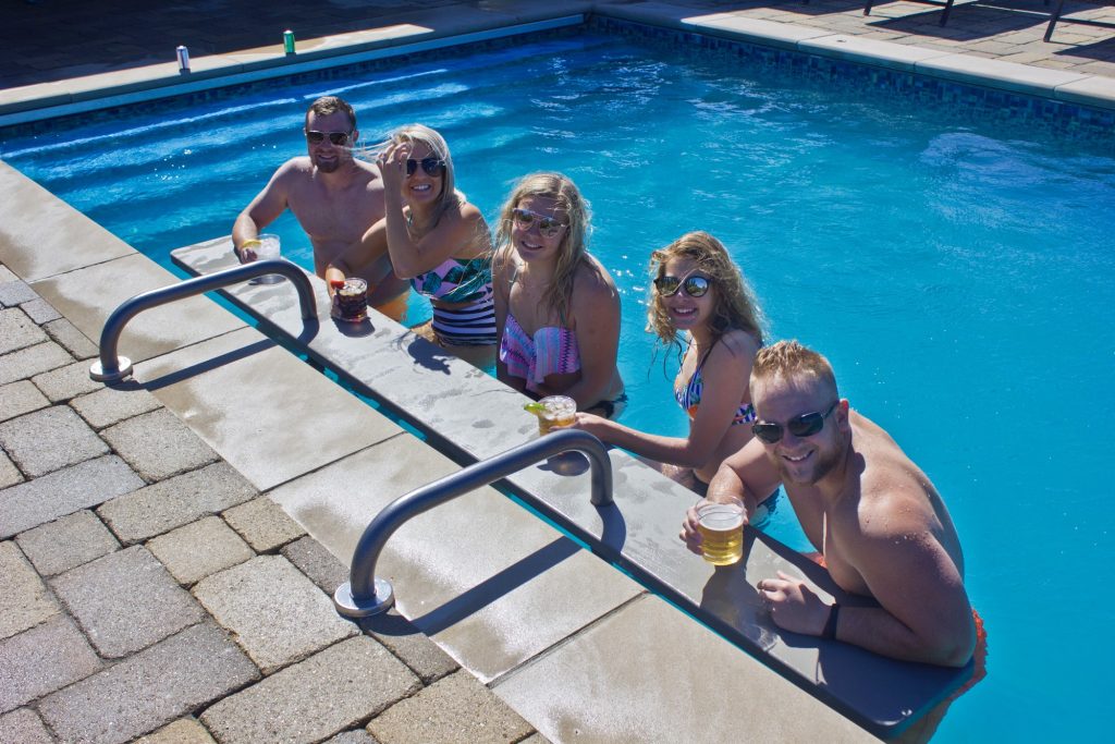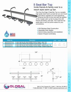 Any resort with an outdoor pool bar is always packed when the weather is warm. But why wait until your next vacation to enjoy a cold beverage in the pool when you can add Global Pool Products’ five seat bar for swimming pools? Now’s the time to upgrade your pool experience with Over the Edge 5-Seat Bar Top Table. Add five pool edge chairs and a bar top designed for comfort, safety and the best in-water experience. This bar for your swimming pool simply hangs Over the Edge of the pool using standard ladder holes or new mounts can be added to any pool deck. Your family and friends will be relaxing for hours at your very own outdoor pool bar.