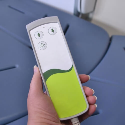The height adjustable bed offers integral lighted and tilting headrests for enhanced comfort.