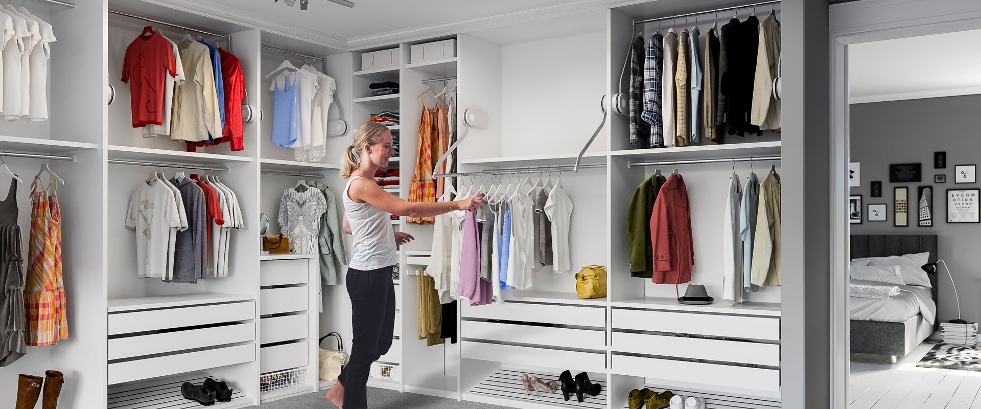 The motor units take up little space and is screwed into the sides of the wardrobe. Height adjustment made by a cable hand control.