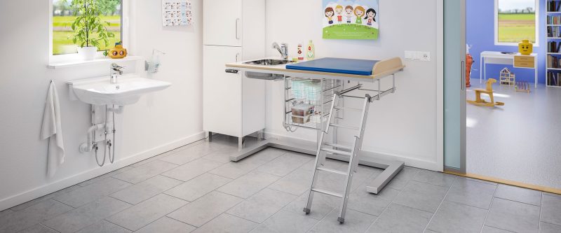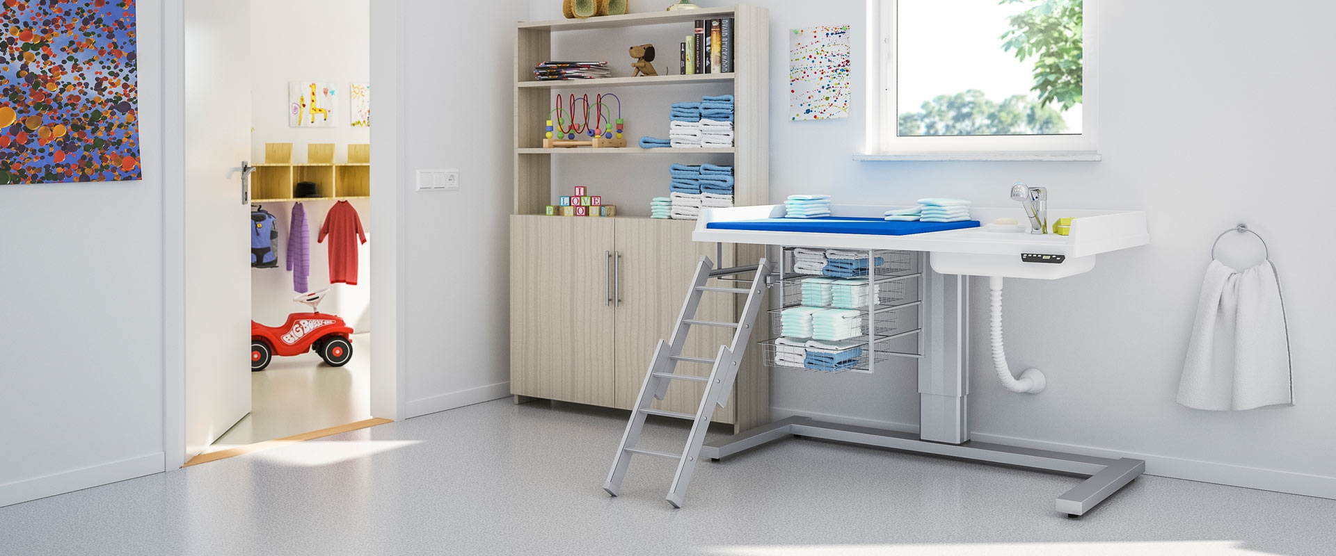 Baby changing table with an adjustable working height of 73 – 113 cm above the floor. The height can be adjusted quickly (3 cm/sec.) and is safe, because only the carer can set their working height. To lessen the heavy lifting required, there is an option to fit steps to the table so that the child can climb up themselves.