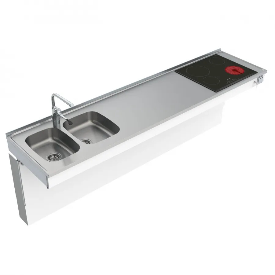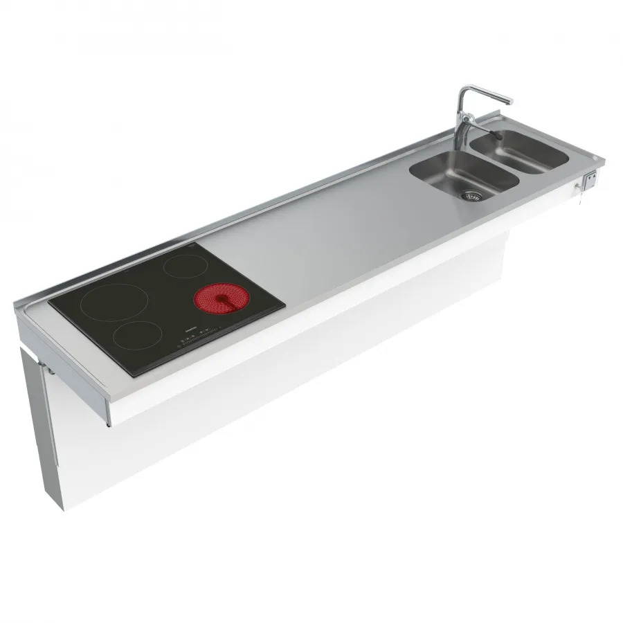 The combi kitchen module is available as wall or floor-mounted motorised or wall-mounted manually height adjustable.