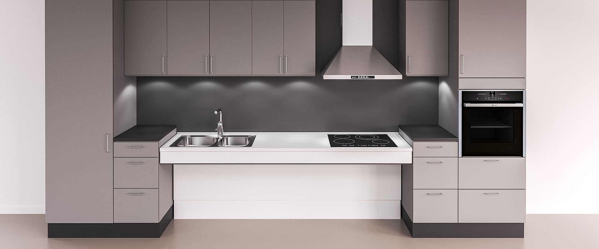 The hob module is available as wall or floor-mounted motorised or wall-mounted manually height adjustable. Choose between front height 1.6″ (40 mm) or 4.1″ (103 mm).