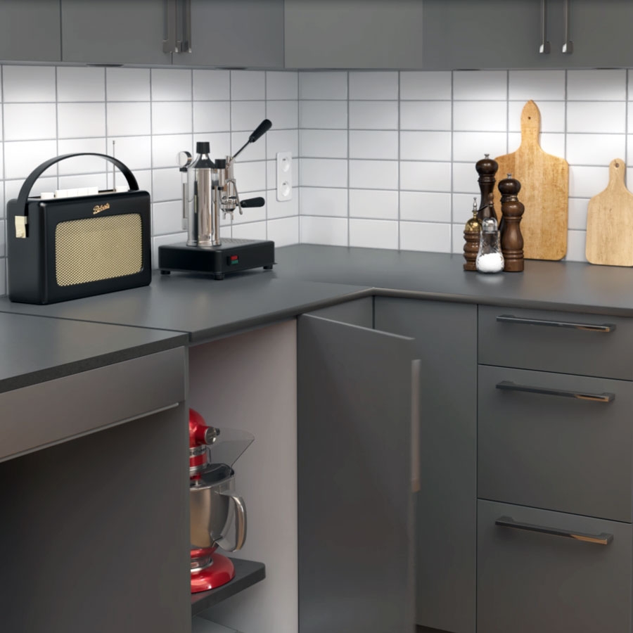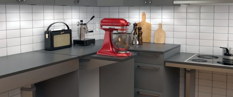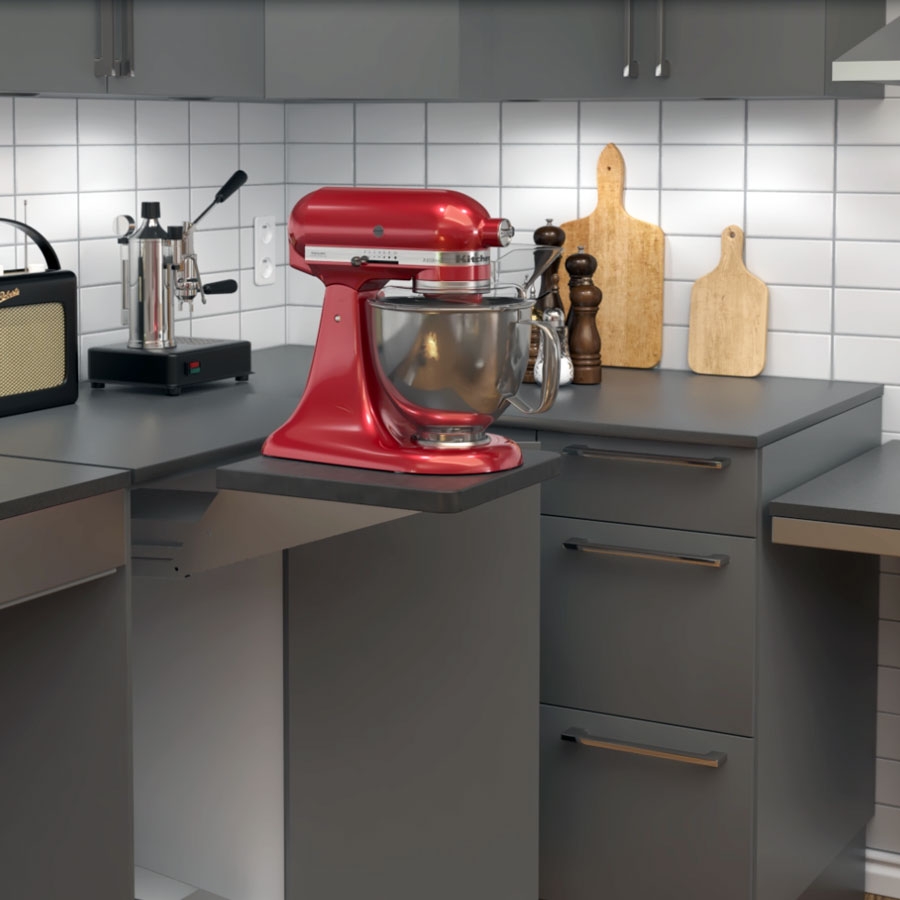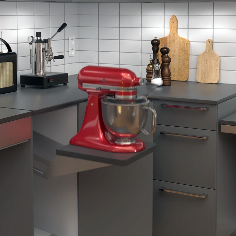 UNILIFT raises a board upwards and outwards from the bottom of a cabinet or tall cabinet. A kitchen appliance, microwave oven or other household machinery can be placed on the board.