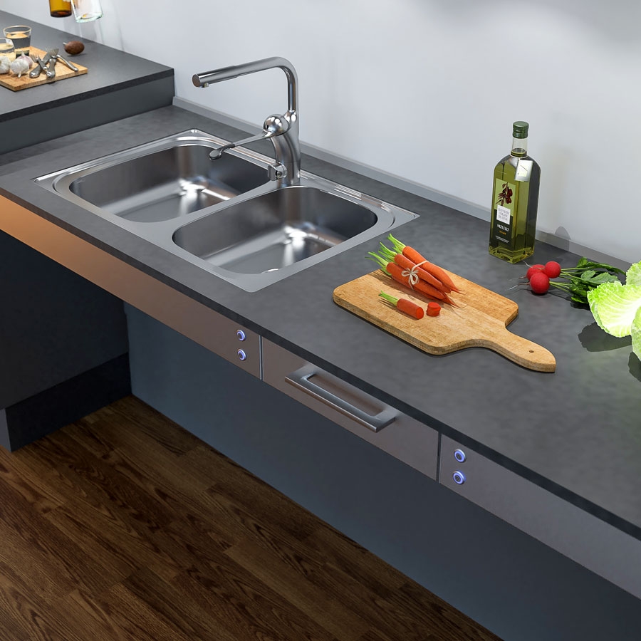 The equipment in the work surface is selected according to the function desired. Sink unit, hob, drawers, chopping boards and other accessories can be integrated in the work surface.