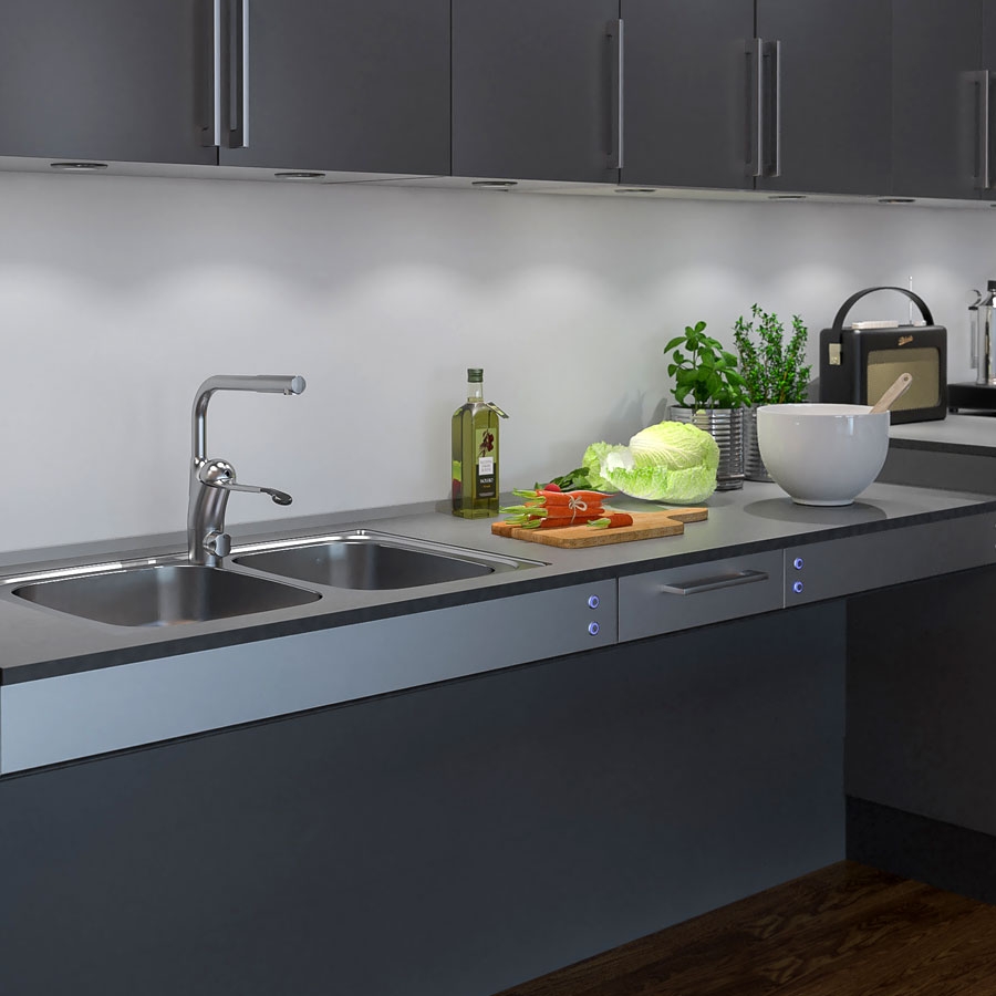 The lift can be used separately or together with Granberg’s wall cabinet lift to totally adapt the kitchen. Space is left open below the work surface for knees and legs. Installations below the work surface, (motors, water, drainage), can be concealed by telescopic cover plates that give the kitchen an attractive appearance.