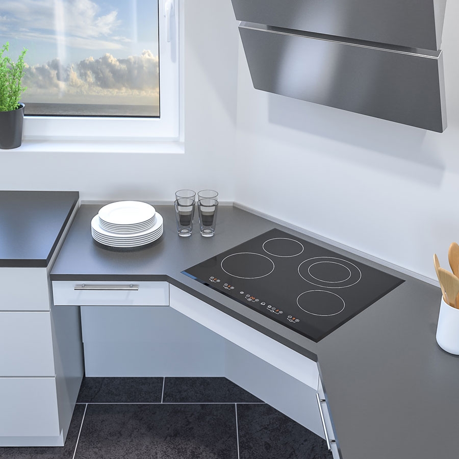 - Motorised corner worktop lift, 90° front edge, 90° wall