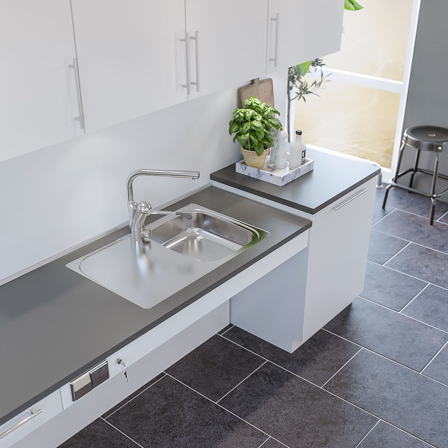The lift can be used separately or together with Granberg’s wall cabinet lift to totally adapt the kitchen. Space is left open below the work surface for knees and legs. Installations below the work surface, (motors, water, drainage), can be concealed by telescopic cover plates that give the kitchen an attractive appearance.