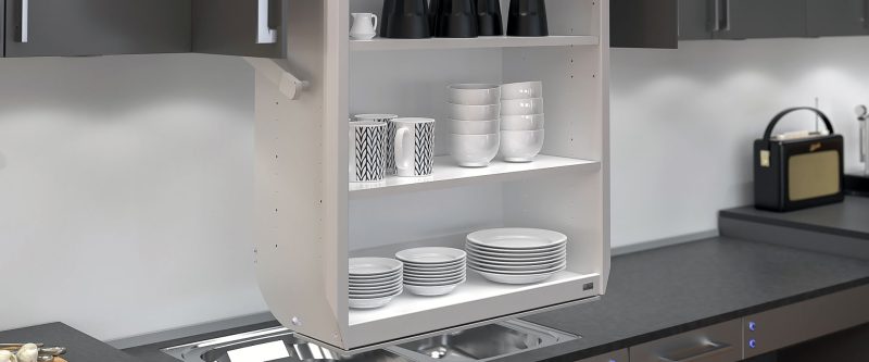 The system also includes a function that automatically opens the doors when the unit is lowered. When the unit goes back into the cabinet, it slows down at the end so the doors are closed gently. The ingenious design also makes it possible to open the doors as usual when the unit is in the raised position.
