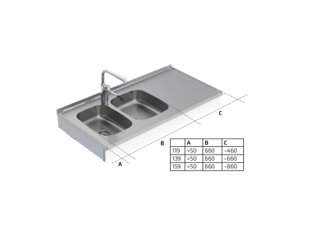 Smooth stainless steel sheet. Raised edge around the entire sink. Thickness: 30 mm