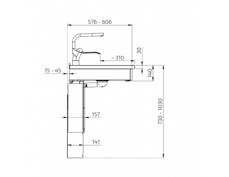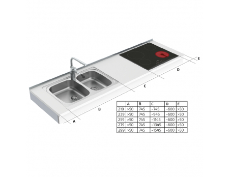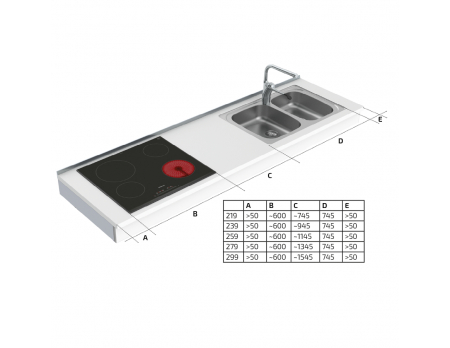 Wall mounted, Manually Height Adjustable Combi Kitchen Module – 6380-ES30S4. The module contains two shallow sink bowls. Prepared for glass ceramic hob with four cooking zones.