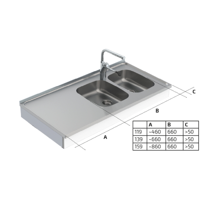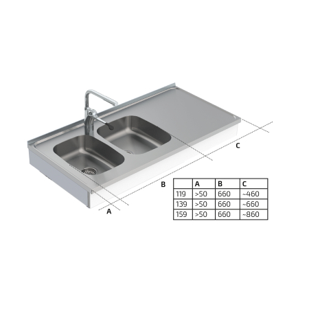 • ESH stainless steel sink with two shallow sink bowls and flexible drain hose