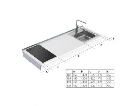 Wall mounted, motorised mini kitchen module 6300-ES11S2 contains two shallow sink bowl with owerflow. Prepared for glass ceramic hob with two cooking zones.