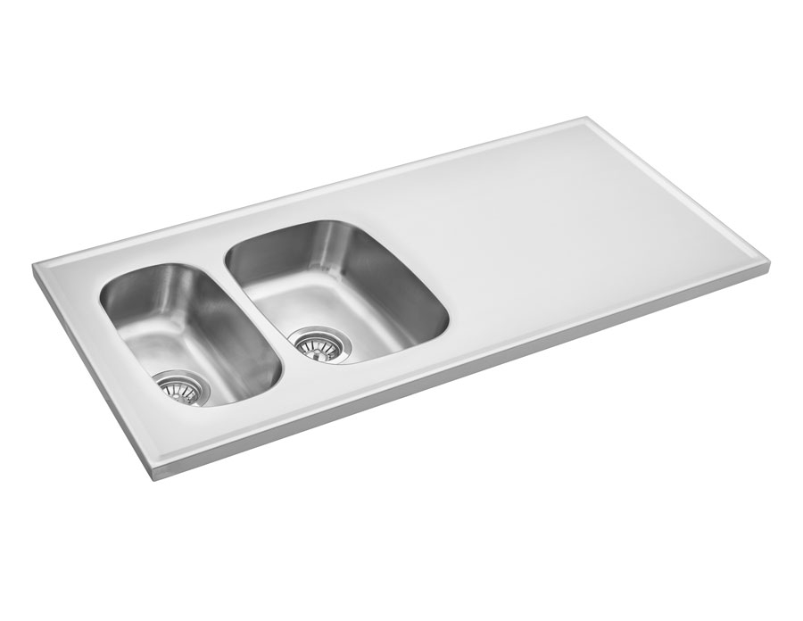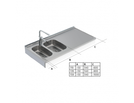 Smooth stainless steel sheet. Raised edge around the entire sink. Thickness: 30 mm