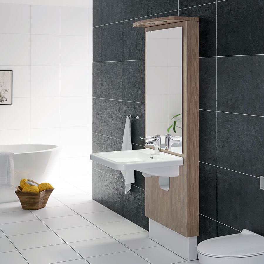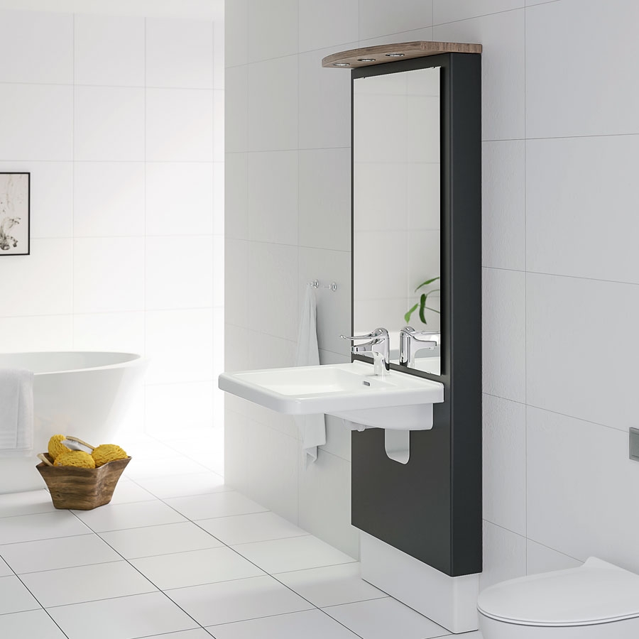 Washbasin, mirror and spotlights move as a complete unit when height is adjusted. The washbasin can be raised to the desired height simply by pushing a button (65 – 90cm when installed at standard height).