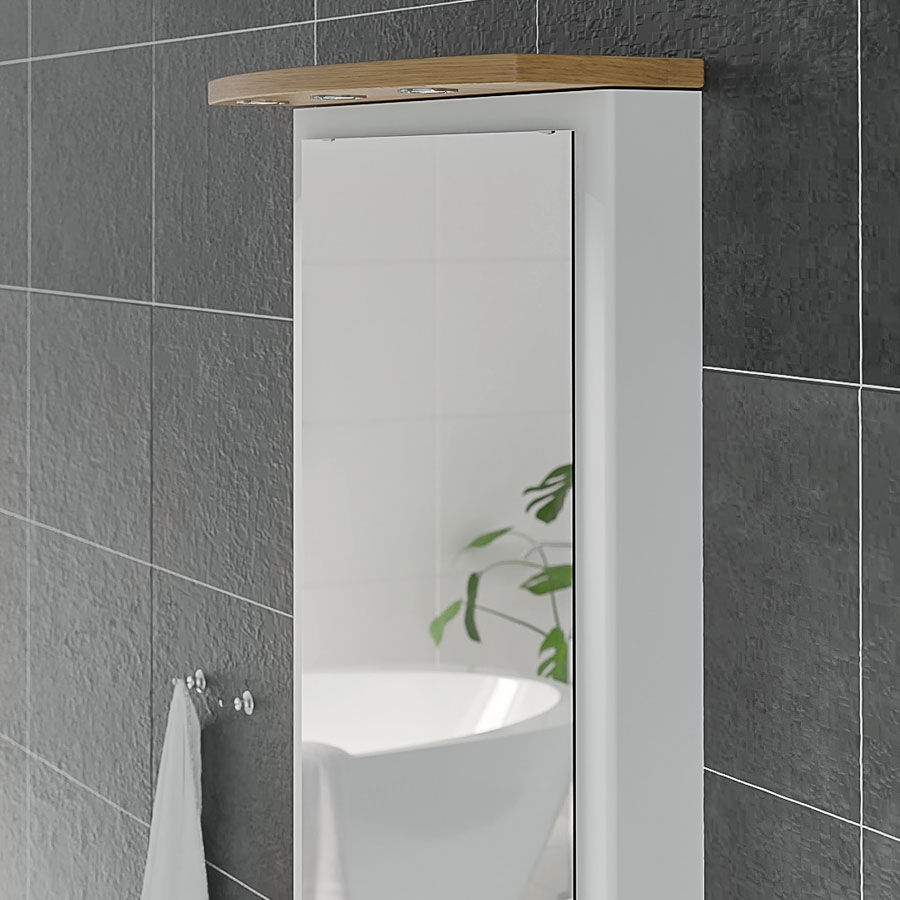 - Mirror and lighting move in tandem with basin
