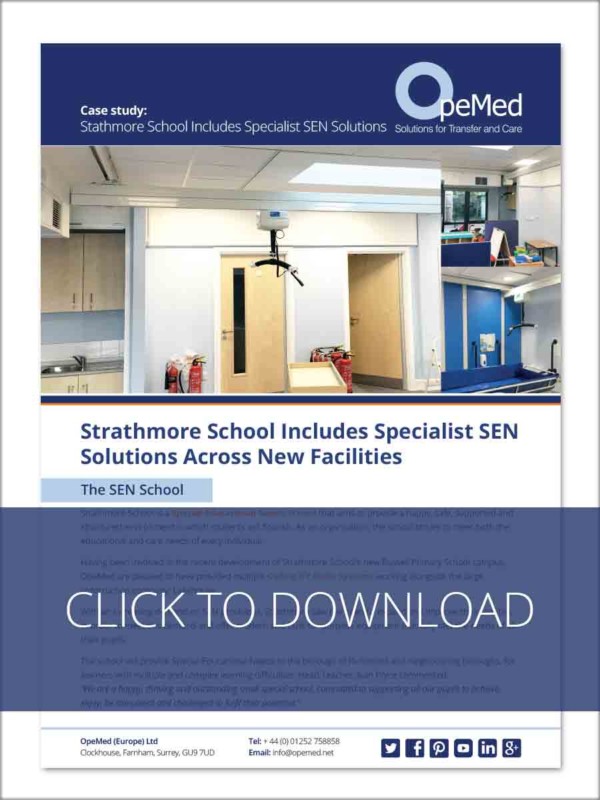 Creating a happy, safe, supported and structured environment is something our customers at Strathmore School strives to achieve. A Specialist Educational Needs School, Strathmore has enlisted OpeMed in a project on their newly built Primary School installing a number of Ceiling Hoists and XY Systems throughout the facility.